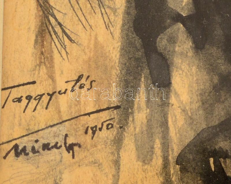 Beschreibung: Hincz jelzéssel: Taggyűlés. Akvarell, papír, üvegezett keretben, 23×40 cm