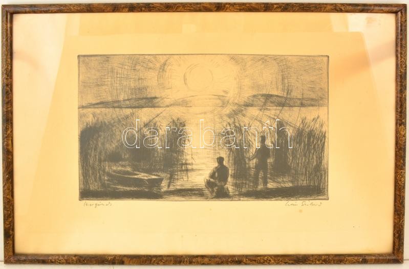 Beschreibung: Iván Szilárd (1912-1988): Horgásznak. Rézkarc, papír, jelzett, üvegezett keretben, 25×38 cm