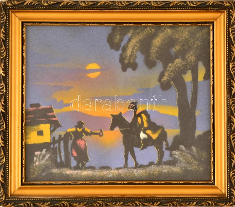 Beschreibung: Jelzés nélkül: Betyár élet. Festett selyemkép, üvegezett keretben, 21×25 cm