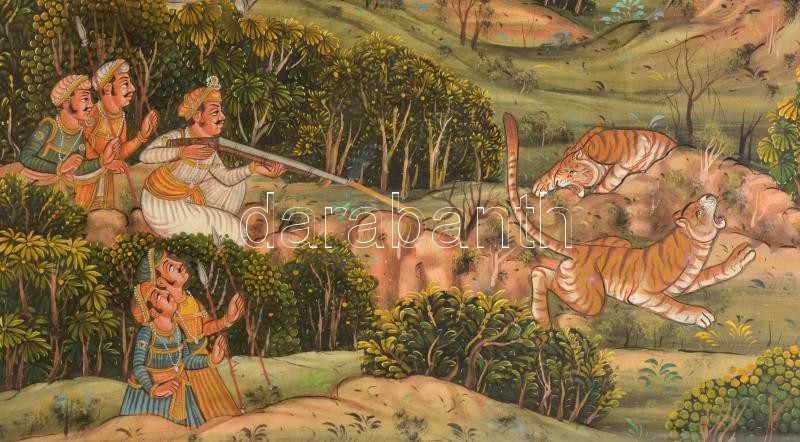 Beschreibung: Jelzés nélkül: Tigrisvadászat, festett selyemkép, üvegezett fa keretben, 49×67,5 cm
