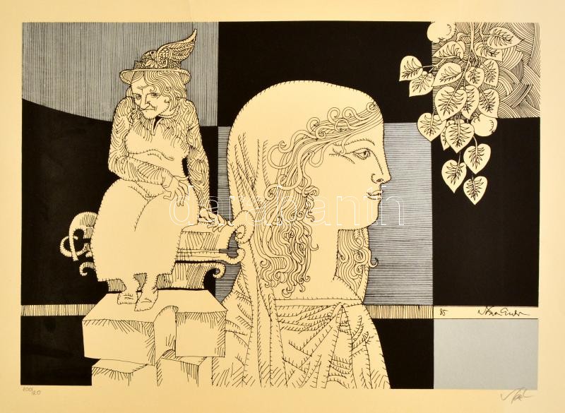 Beschreibung: Szász Endre( 1926-2003): Az öregség szobra. Szitanyomat, papír, jelzett, 29×42 cm