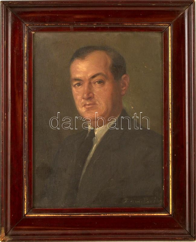 Beschreibung: Zilahi Pogány Lajos (1873-?): Férfi portré. Olaj (besötétedett), fatábla, jelzett, keretben, 27×19 cm