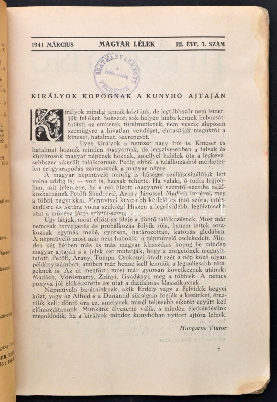 1934-1943 Magyar Lélek folyóirat 4 száma (V. évf. 10. sz. 1943. okt., III. évf. 1.,3.,5. sz. 1941. január, március, május, közte egy sérült, foltos. + Koszorú. Petőfi Társaság Közlönye. VII. köt. 4. sz., 1941. június., foltos, kissé szakadozott gerinccel.+Erdélyi Iskola 5 száma (II. évf. 1-2.,3-4., 7-8.,VI. évf. 1-2.,3-4. sz.), az egyik példány sarka sérült, hiányos, közte foltosak. Összesen 10 db. folyóirat, változó, többnyire kissé viseltes állapotban, közte foltos, sérült is.