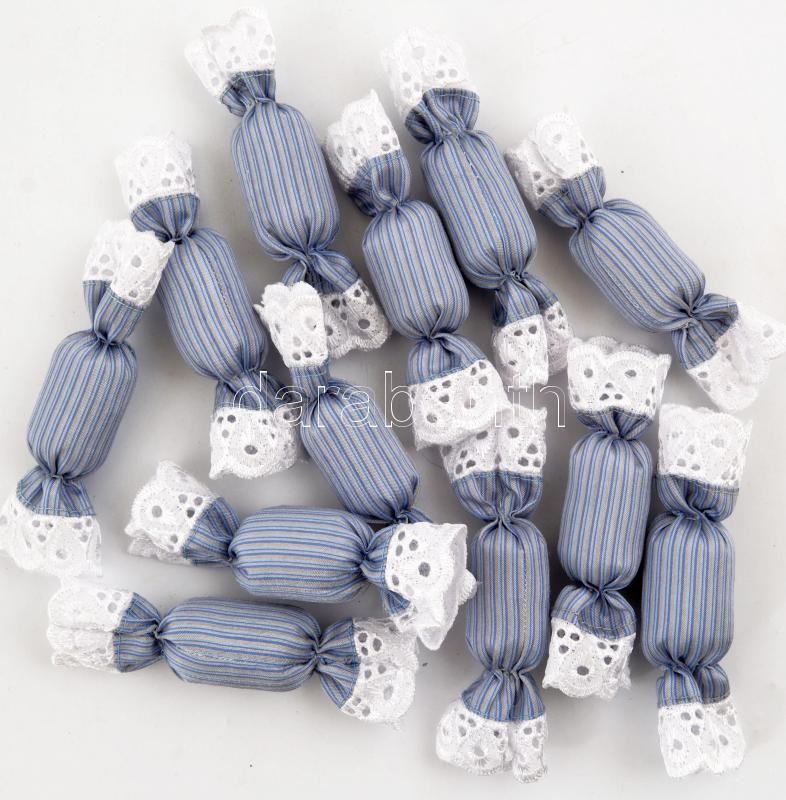 Beschreibung: Csipkés, kék csíkos textil szaloncukor, 12 db, h: 12 cm