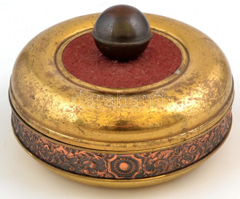 Beschreibung: Vegyes bizsu tétel, benne nyakláncok, medálok, kitűzők, egy figurával, kör alakú réz dobozban, benne egy sérülttel, d: 14 cm.