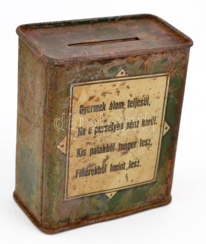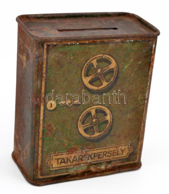 Beschreibung: cca 1930 Fém takarékpersely,. Kopott, alja nélkül. 10x8 cm