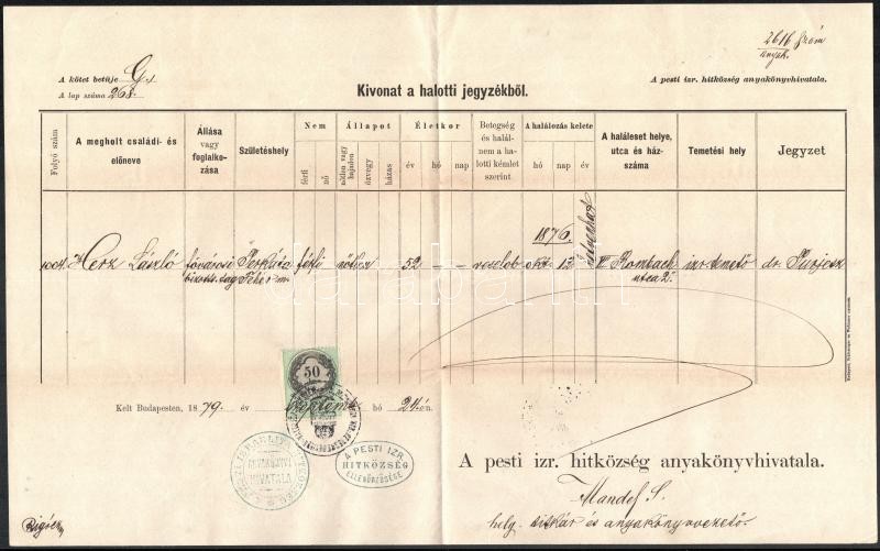 Beschreibung: 1879 Bp., Halotti anyakönyvi kivonat 50 kr okmánybélyeggel