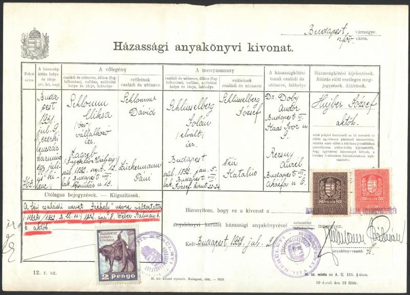 1932 Bp., Házassági anyakönyvi kivonat okmánybélyegekkel https://www.darabanth.com/de/360-Fernauktion/360.0/Kunst-Dokumente-andere-Sammelgebiete/Judaica~500024/1932-Bp-Hazassagi-anyakonyvi-kivonat-okmanybelyegekkel~II2073684