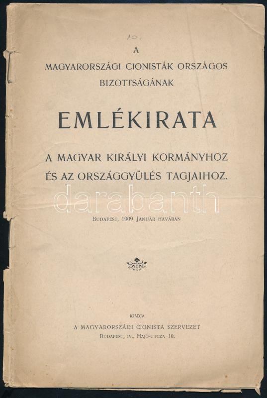 A magyarországi cionisták országos bizottságának emlékirata a magyar királyi kormányhoz és az országgyűlés tagjaihoz Bp. 1909. Magyarországi Cionista Szervezet. 7 lev.