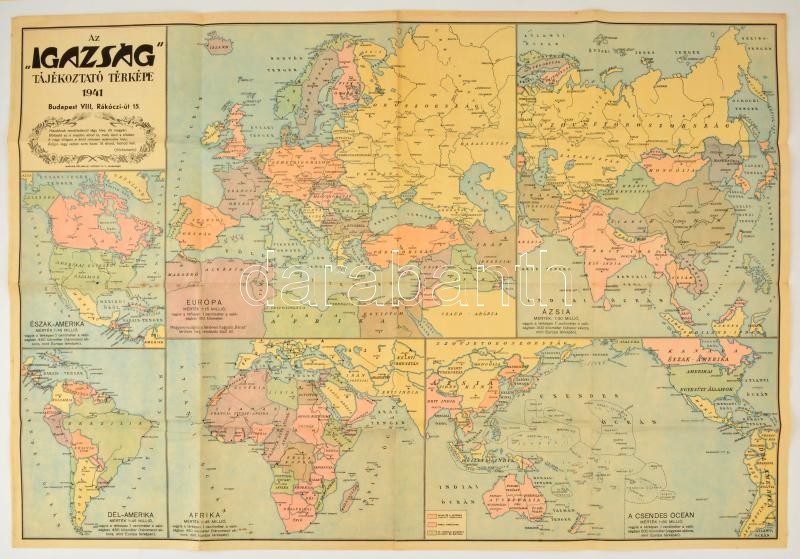 1941 Az Igazság folyóirat tájékoztató térképegyüttese, egy lapon Európa, Ázsia, Észak-Amerika, Dél-Amerika Afrika és a Csendes-óceán térképével, különféle léptékekben 82×57,5 cm