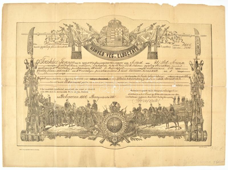 1886 Debrecen, gyalogos és III. o. puskaműves díszes végelbocsájtó levele, m. kir. 3. honvéd gyalog féldandár, a féldandár parancsnoka, Becsey Antal ezredes aláírásával, szakadt, hajtásnyomokkal, 35x48 cm