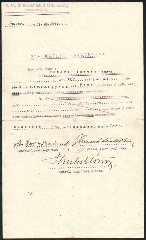 1941 M. Kir. 3. honvéd tábori tüzér osztály parancsnoksága által kiáll... https://www.darabanth.com/de/360-Fernauktion/360.0/Kunst-Dokumente-andere-Sammelgebiete/Militaria~500027/1941-M-Kir-3-honved-tabori-tuzer-osztaly-parancsnoksaga-altal-kiallitott-szarmazasi-ig~II2071845