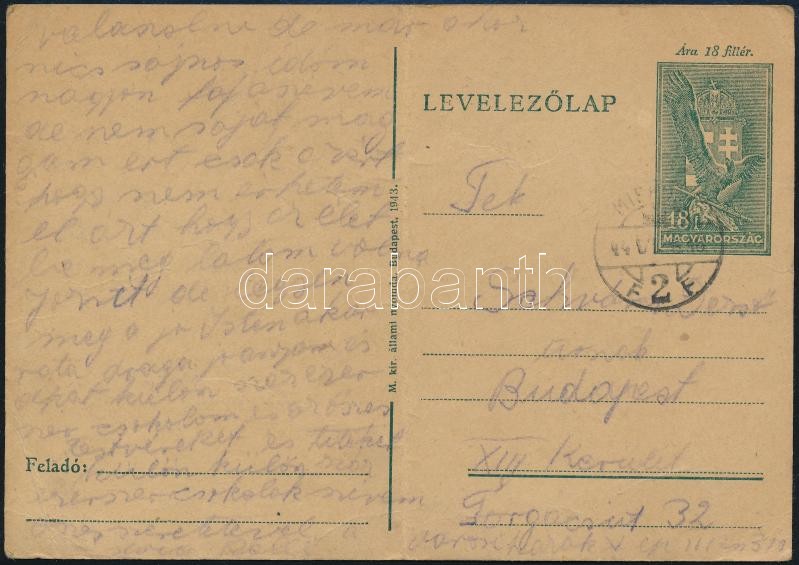 Beschreibung: 1944 Munkaszolgálatos tábori postai levelezőlapja
