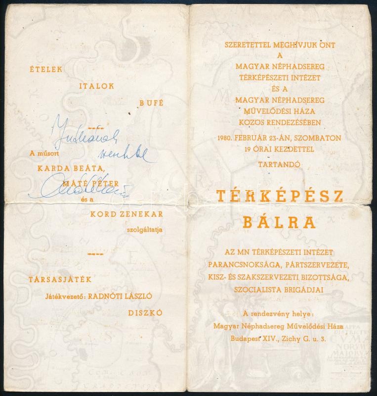 Beschreibung: 1980 Máté Péter (1947-1984) énekes aláírása a Térképész Bál meghívóján, hajtásnyomokkal.