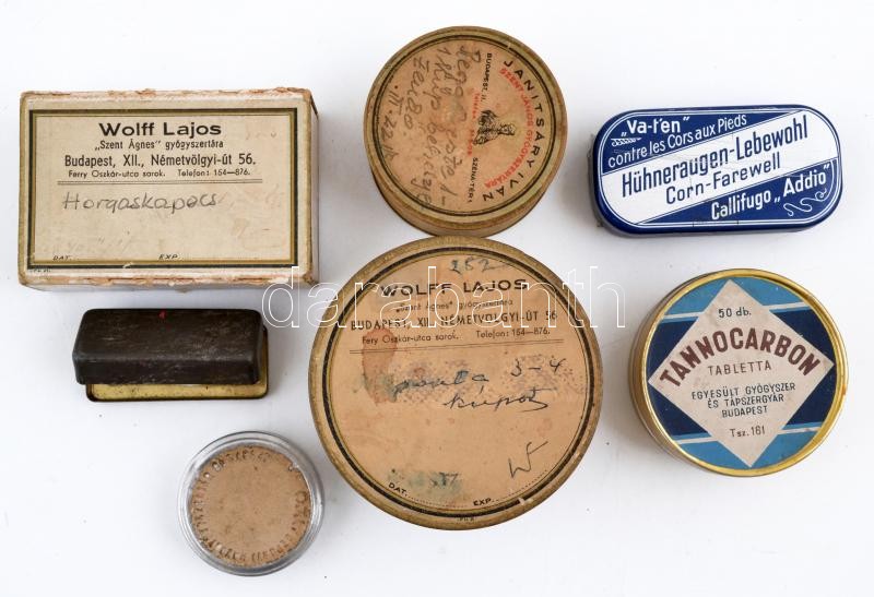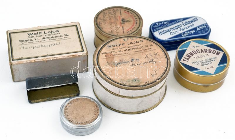 Beschreibung: 3 db gyógyszertári pirulás doboz: Wolff Lajos Szent Ágnes gyógyszertára Bp., XII. (2 klf), Janitsáry Iván Szent János gyógyszertára Bp. II. + 4 db fém gyógyszeres doboz