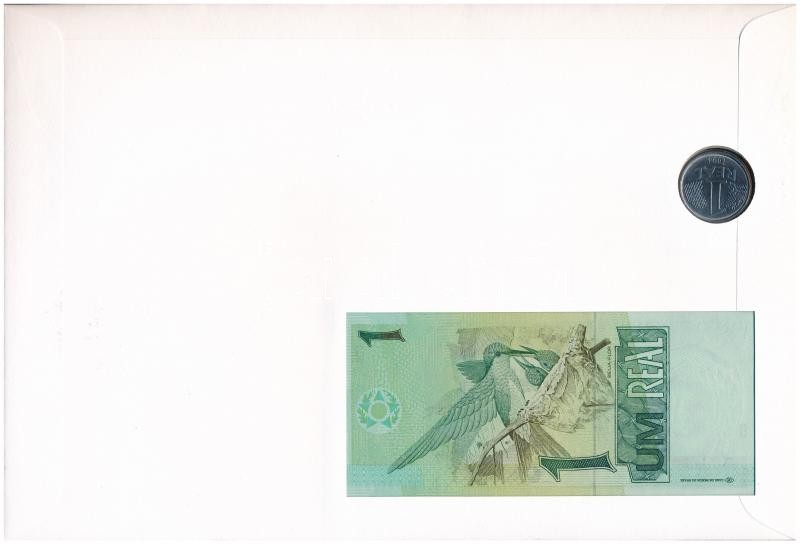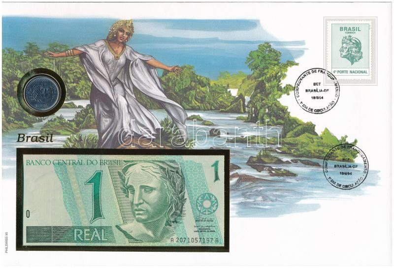Beschreibung: Brazília érmés és bankjegyes, pecsételt boríték benne 1994. 1R rozsdamentesacél érmével és 1994-1997. 1R bankjeggyel a PHILSWISS kiadásában, német leírással T:1,I
