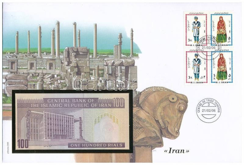 Iran 1985... https://www.darabanth.com/de/360-Fernauktion/360.0/Numismatik/Umschlage-mit-Munzen-und-Banknoten~2000004/Iran-1985-100R-felbelyegzett-boritekban-belyegzessel-TI--Iran-1985-100-Rials-in-envelope-~II2074530