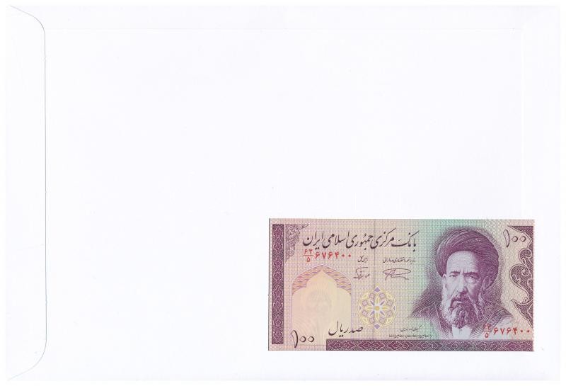 Iran 1985- 100 Rials in envelope with stamp and cancellation C:UNC