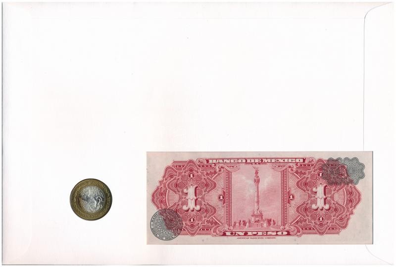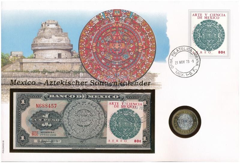 Mexikó "Azték naptár" érmés és bankjegyes, pecsételt boríték benne 1994. 10P érmével és 1969. 1P bélyeggel és pecsételt bankjeggyel a PHILSWISS kiadásában, német leírással T:1,I
