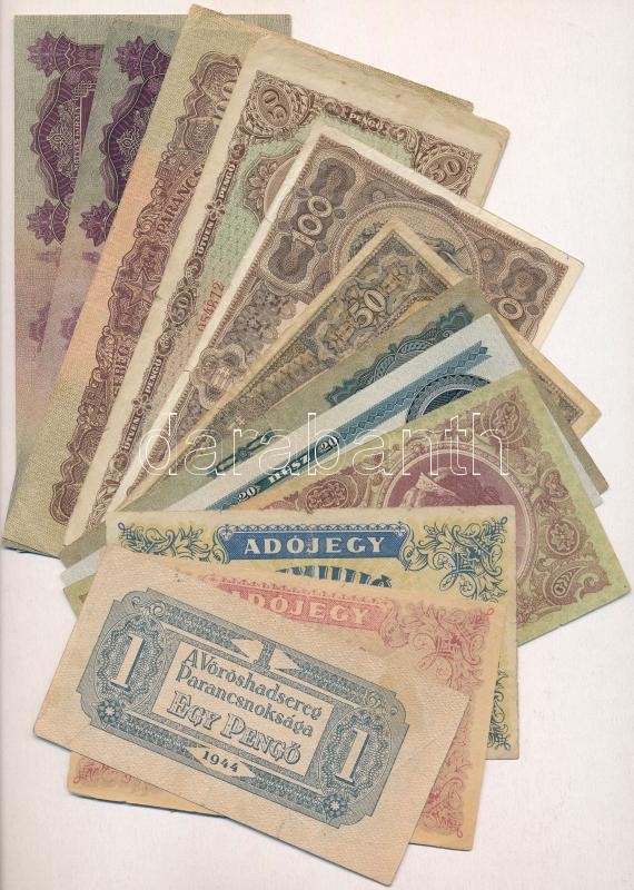 Beschreibung: 14db-os vegyes magyar korona, pengő, adópengő és forint bankjegy tétel, közte 1920. 50K, 1930. 20P, 1945. 50P T:III,III-
