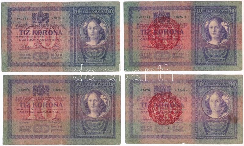 1904. 10K (4x) ebből 2db piros "MAGYARORSZÁG" körbélyegzővel... https://www.darabanth.com/de/360-Fernauktion/360.0/Numismatik/Ungarische-Banknoten~2000007/1904-10K-4x-ebbol-2db-piros-MAGYARORSZAG-korbelyegzovel-TIII-III-IV~II2070712