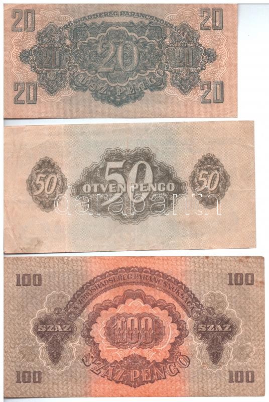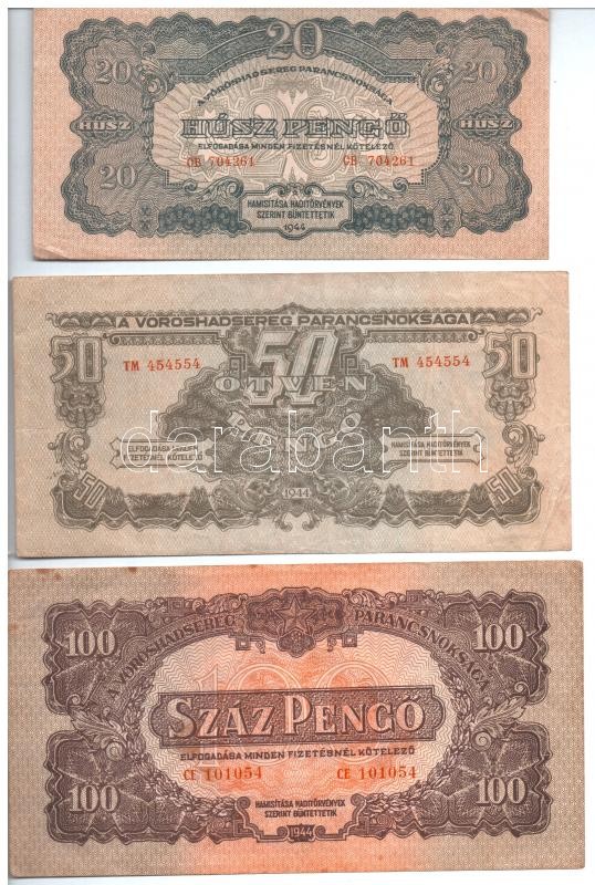 1944. 1P-100P "A Vöröshadsereg Parancsnoksága" (7xklf) T:III... https://www.darabanth.com/de/360-Fernauktion/360.0/Numismatik/Ungarische-Banknoten~2000007/1944-1P-100P-A-Voroshadsereg-Parancsnoksaga-7xklf-TIII-szep-papir~II2070913