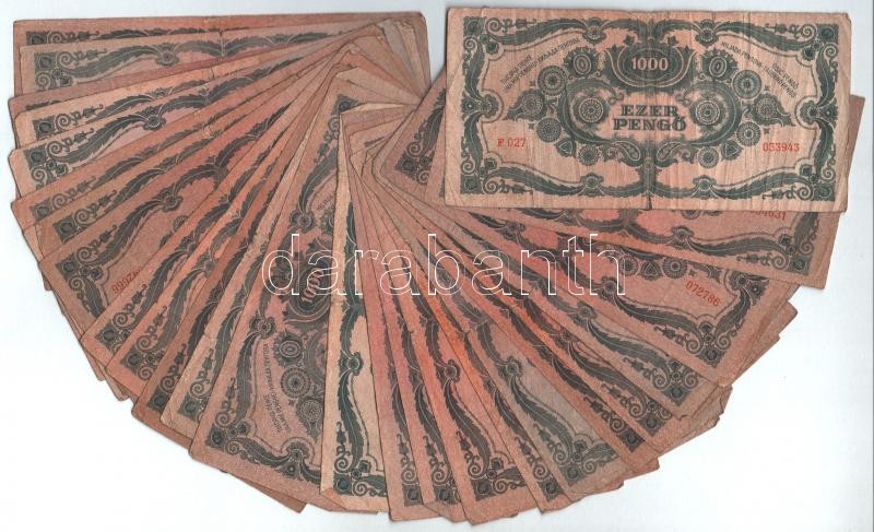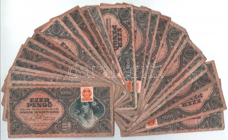 1945. 1000P (27x) "MNB" bélyeggel T:III Adamo P22e https://www.darabanth.com/de/360-Fernauktion/360.0/Numismatik/Ungarische-Banknoten~2000007/1945-1000P-27x-MNB-belyeggel-TIII-Adamo-P22e~II2066144