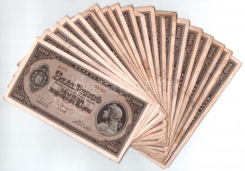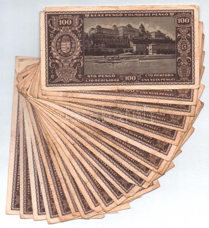 1945. 100P (22x) T:III,III- Adamo P18 https://www.darabanth.com/de/360-Fernauktion/360.0/Numismatik/Ungarische-Banknoten~2000007/1945-100P-22x-TIII-III-Adamo-P18~II2065974