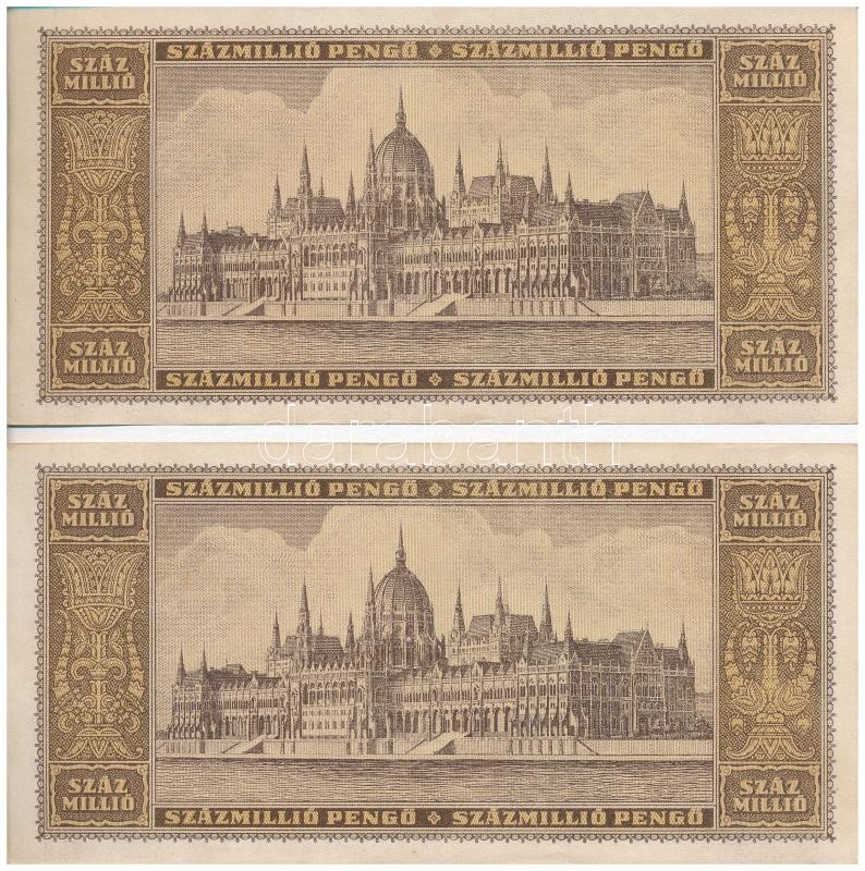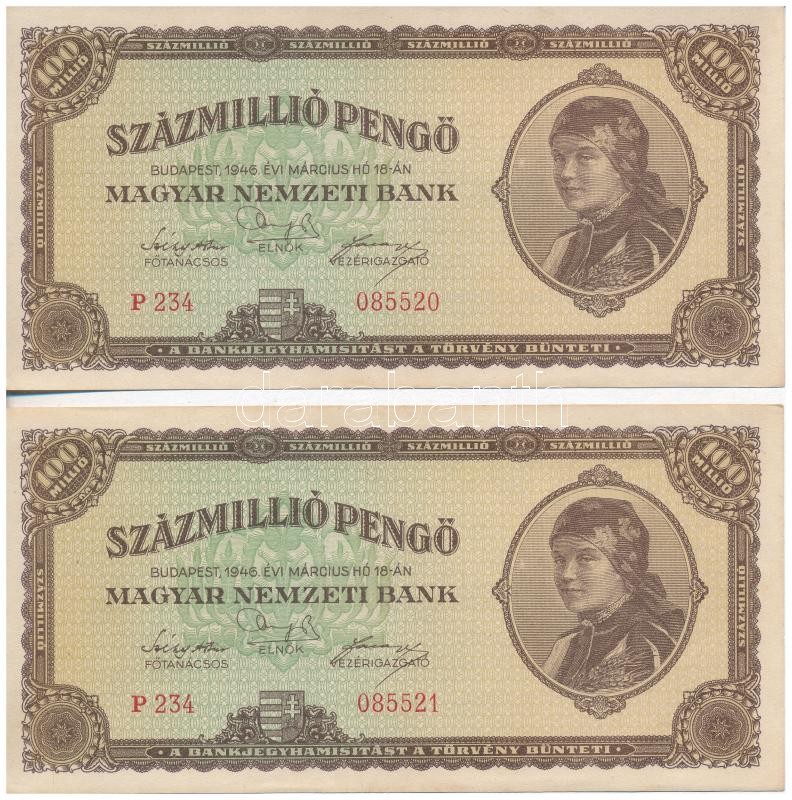 1946. 100.000.000P (2x) sorszámkövetők T:I- https://www.darabanth.com/de/360-Fernauktion/360.0/Numismatik/Ungarische-Banknoten~2000007/1946-100000000P-2x-sorszamkovetok-TI-~II2061476
