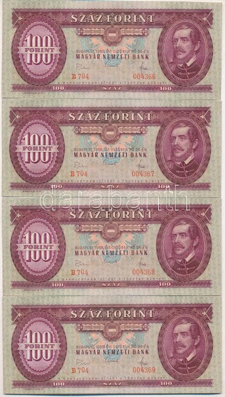 1968. 100Ft (4x) sorszámkövető T:II https://www.darabanth.com/de/360-Fernauktion/360.0/Numismatik/Ungarische-Banknoten~2000007/1968-100Ft-4x-sorszamkoveto-TII~II2078546