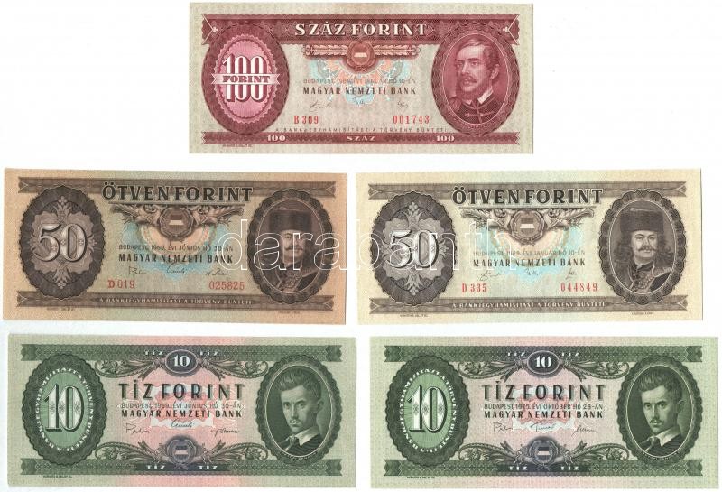 1969. 10Ft + 50Ft + 1975. 10Ft + 1989. 50Ft + 100Ft T:I,II https://www.darabanth.com/de/360-Fernauktion/360.0/Numismatik/Ungarische-Banknoten~2000007/1969-10Ft-plus-50Ft-plus-1975-10Ft-plus-1989-50Ft-plus-100Ft-TI-II~II2075302