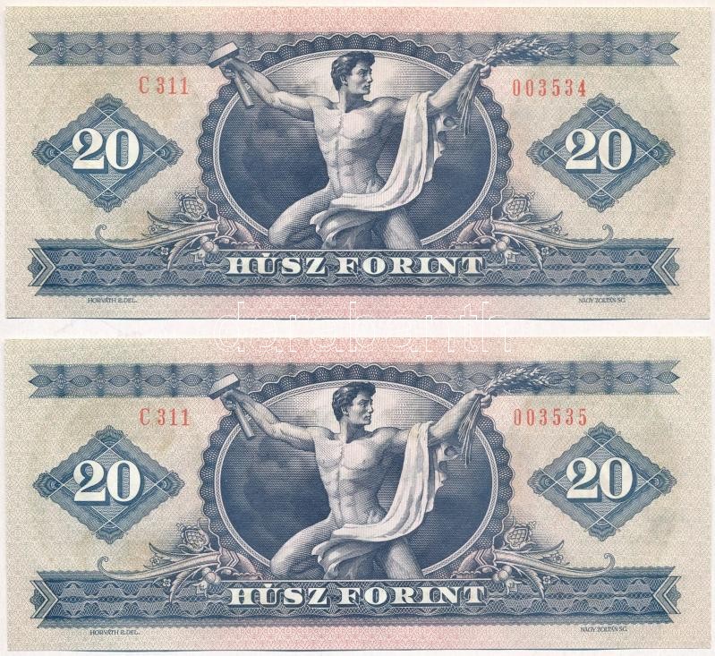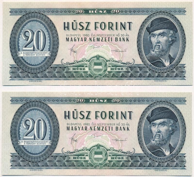 1980. 20Ft (2x) sorszámkövető T:I- https://www.darabanth.com/de/360-Fernauktion/360.0/Numismatik/Ungarische-Banknoten~2000007/1980-20Ft-2x-sorszamkoveto-TI-~II2078547