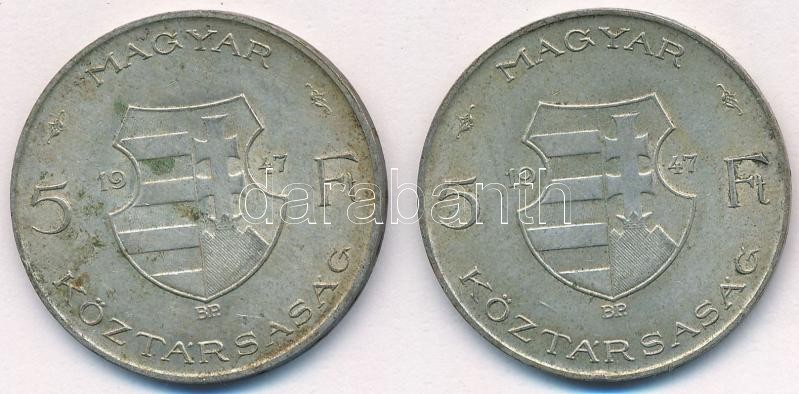 1947. 5Ft Ag "Kossuth" (2x) T:2,2- patina, ph. Adamo F8.1 https://www.darabanth.com/de/360-Fernauktion/360.0/Numismatik/Ungarische-Munzen-und-Munzen-mit-ungarischem-Munzzeichen~2000008/1947-5Ft-Ag-Kossuth-2x-T2-2-patina-ph-Adamo-F81~II2071910