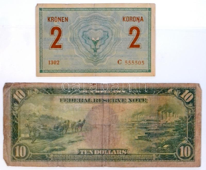 Amerikai Egyesült Államok 1921-1928. (1914) 10$ "Federal Reserve Note", "Frank White - Andrew W. Mellon" nagyméretű, kék pecséttel+ Magyarország 1914. 2K "C" sorszámjel T:III