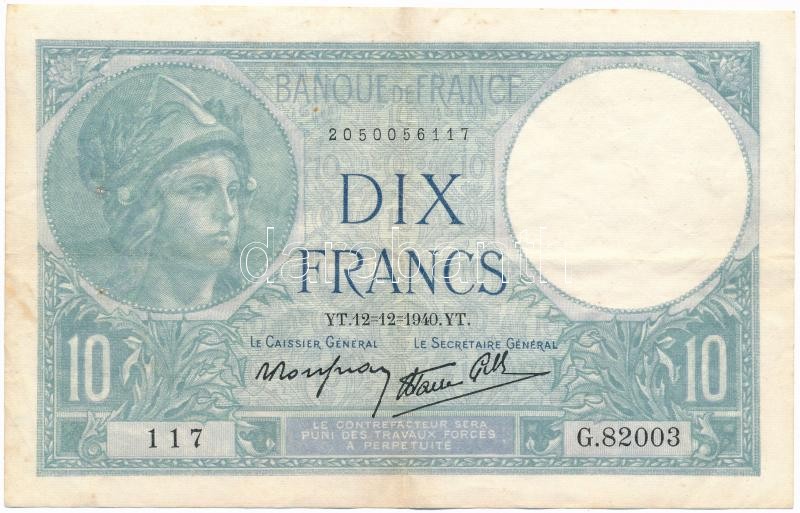France 1940. 10 Francs C:F https://www.darabanth.com/de/360-Fernauktion/360.0/Numismatik/Weltweit-Banknoten~2000013/Franciaorszag-1940-10Fr-TIII-France-1940-10-Francs-CF~II2073186