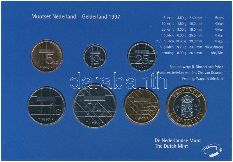 Hollandia 1997. 5c-5G (6xklf) + "Gelderland" emlékérem forgalmi sor karton dísztokban T:1 Hollandia 1997. 5 Cents - 5 Gulden (6xdiff) + "Gelderland" commemorative coin, coin set in cardboard case C:UNC
