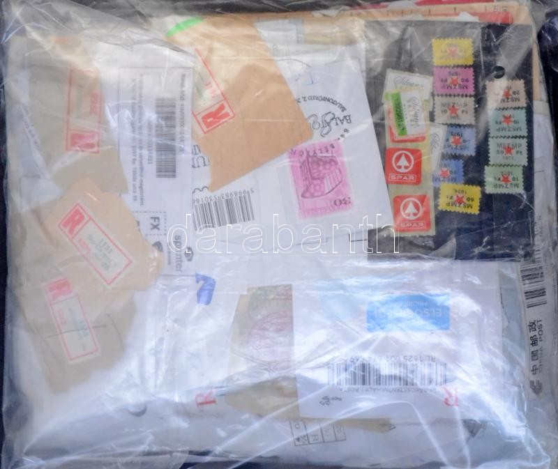 0,65 kg vegyes parafilatélia, benne áztatnivalók, ragjegyek, gépi bélyegzések, bélyegpótló címkék, levélzárók, bélyegzések, postai nyomtatványok, díjjegy kivágások stb.