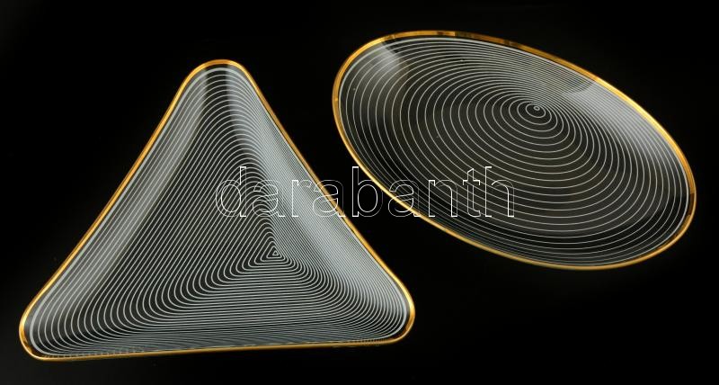 Beschreibung: 2 db aranyozott szélű. csíkozott üveg tálka, 23x14 cm, 23x23 cm