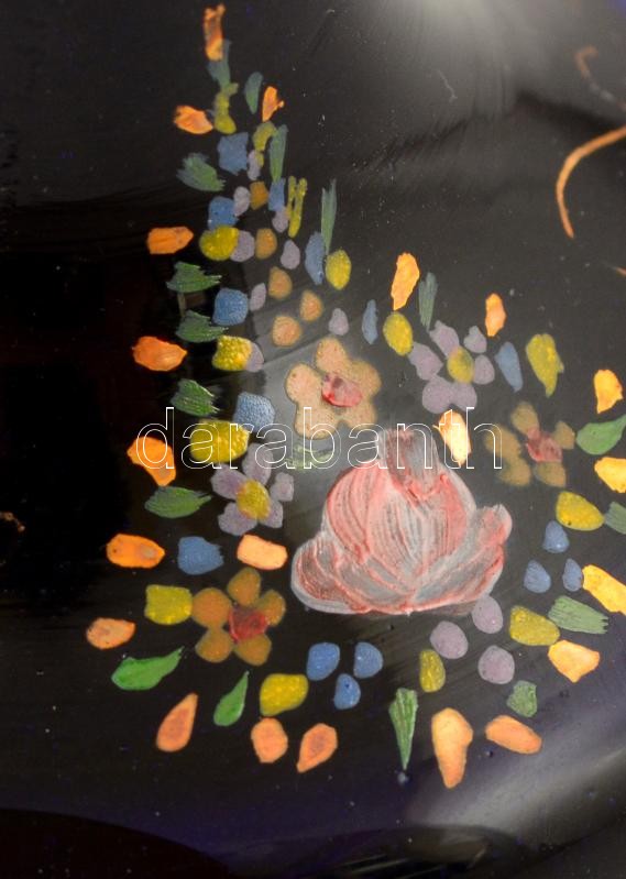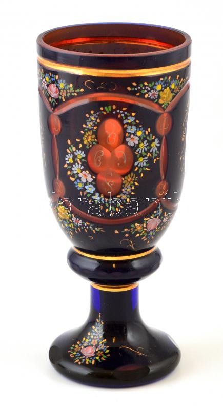 Beschreibung: cca 1920 fújt talpas pohár, kézzel festett, több rétegű, kopott, m: 18 cm