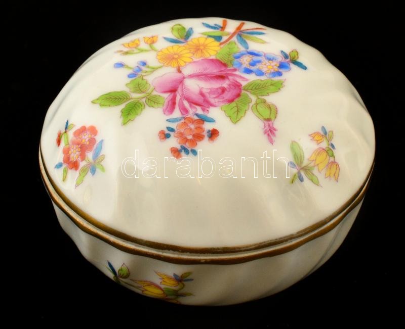 Beschreibung: Herendi virág mintás ékszerdobozka, kézzel festett, jelzett, apró kopásnyomokkal, d: 6,5 cm