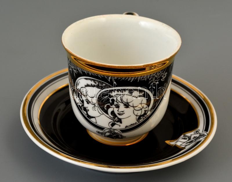 Beschreibung: Hollóházi Jurcsák László által tervezett mintával díszített porcelán mokkás készlet, matricás, jelzett, hibátlan