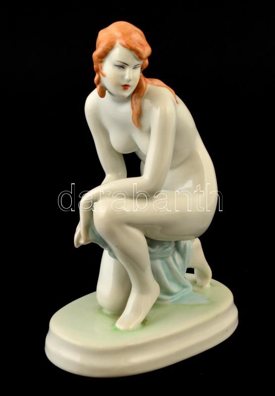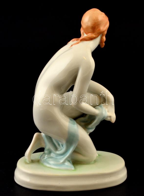Beschreibung: Zsolnay Zsuzsanna (térdelő női akt), kézzel festett, jelzett, apró kopásnyomokkal, m: 22,5 cm