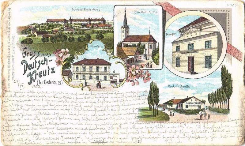 1902 Sopronkeresztúr, Németkeresztúr, Deutschkreutz bei Oedenburg; Eszterházy kastély, Római katolikus templom és plébánia, Rezső forrás, zsinagóga / Schloss, Kirche, Pfarrhaus, Rudolf-Quelle, Israelitischer Tempel / castle, church, rectory, spring well, synagogue. L. Kummert Art Nouveau, floral, litho (kopott élek / worn edges)