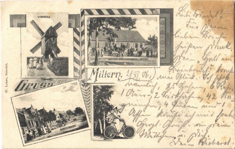 Beschreibung: 1906 Miltern, Windmühle, Gasthof zur Eisenbahn v. Mewes, Dorfstrasse. W. Lohse / windmill, railway inn, street view, lady with bicycle. Art Nouveau (EB)
