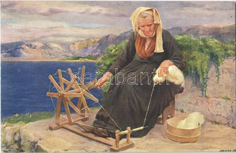 Rakousko-uher. typy lidové. Serie XVIII. c. 5. Istrie. II. Stará zena z Omislja (ostrov Krk). Nakladem R. Prombergra / Austro-Hungarian folklore from Omisalj, Krk s: L. Kleinmondové
