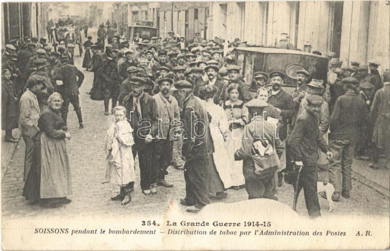 1915 Soissons pendant le bombardement, Distribution de tabac par L'Administration des Postes / the city during the WWI bombings, tobacco distribution, automobiles