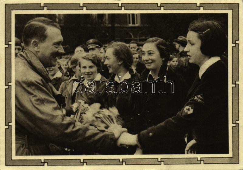 Adolf Hitler with Hitlerjugend. NSDAP German Nazi Party propaganda 6+1... https://www.darabanth.com/de/361-Fernauktion/361.0/Ansichtskarten/Herrscher-Politiker-Konigshauser~1500097/Adolf-Hitler-with-Hitlerjugend-NSDAP-German-Nazi-Party-propaganda-6plus19-Ga-plus-So-Stpl~II2085902