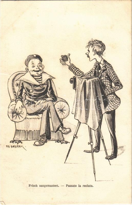Beschreibung: Frisch ausgemustert / Passato la recluta / K.u.K. Kriegsmarine Matrose / Austro-Hungarian Navy mariner humour art postcard. G. Fano, Pola 1910-11. 1637. s: Ed. Dworak (fl)
