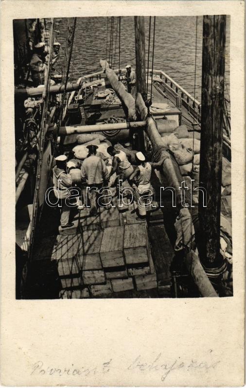 Löveg és muníció behajózása segédhajóval, matrózok pakolás közben / WWI Austro-Hungarian Navy K.u.K. Kriegsmarine, mariners embark guns and ammunition from the support vessel. photo