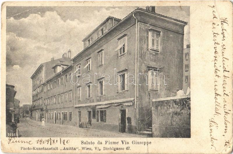 1909 Fiume, Rijeka; Via Giuseppe / utca, Milan Bach üzlete / street vi... https://www.darabanth.com/de/361-Fernauktion/361.0/Ansichtskarten/Kroatien~1500010/1909-Fiume-Rijeka-Via-Giuseppe-utca-Milan-Bach-uzlete-street-view-shops-Photo-Kunstanstalt~II2080449